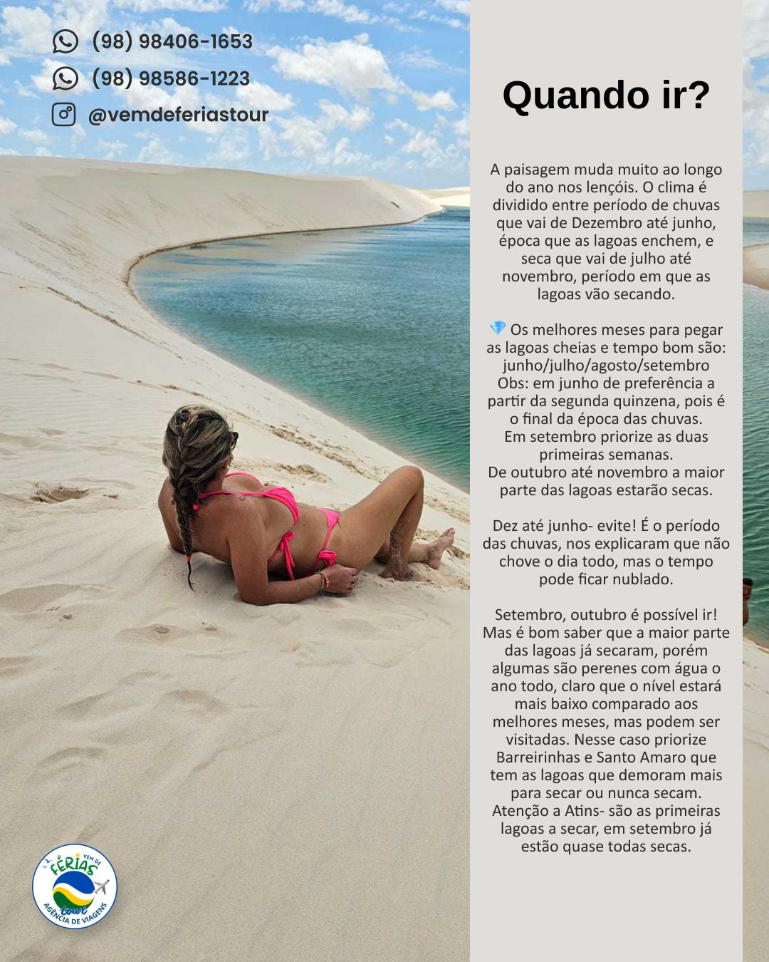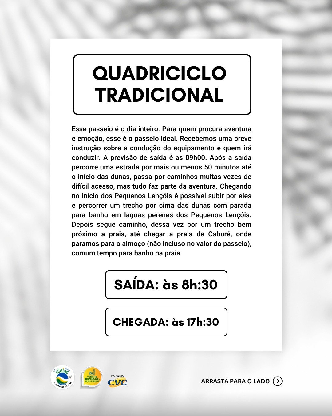 Esse passeio é o dia inteiro. Para quem procura aventura e emoção, esse é o passeio ideal. Vamos para um local de saída às 08:30 onde recebemos uma breve instrução sobre a condução do equipamento e quem irá conduzir. A previsão de saída é as 09h00. Após a saída percorre uma estrada por mais ou menos 50 minutos até o início das dunas, passa por caminhos muitas vezes de difícil acesso, mas tudo faz parte da aventura. Chegando no início dos Pequenos Lençóis é possível subir por eles e percorrer um trecho por cima das dunas com parada para banho em lagoas perenes dos Pequenos Lençóis. Depois segue caminho, dessa vez por um trecho bem próximo a praia, até chegar a praia de Caburé, onde paramos para o almoço (não incluso no valor do passeio), comum tempo para banho na praia e por volta das 14h30 retornamos para Barreirinhas com previsão de chegada às 17:30.OBS: Valor sujeito a alteração mediante a quantidade de pessoas.