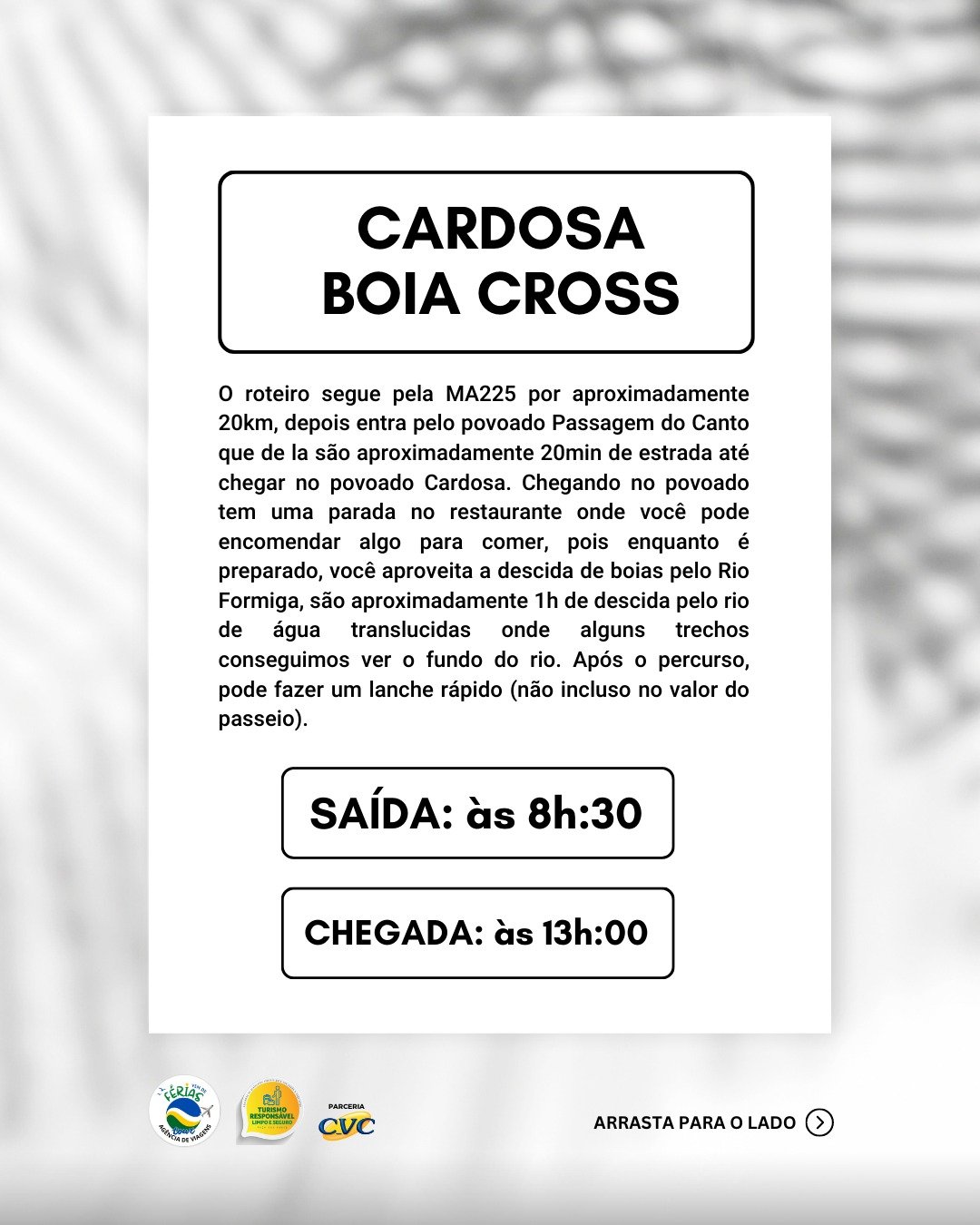 Esse passeio é meio período, com saída a partir das 08h:30. O roteiro segue pela MA225 por aproximadamente 20km depois entra pelo povoado Passagem do Canto que de lá são aproximadamente 20 minutos de estrada até chegar no povoado Cardosa. Chegando no povoado tem uma parada no restaurante onde você pode encomendar algo para comer, pois enquanto é preparado você aproveita a descida de boias pelo rio Formiga, são aproximadamente 1 hora de descida pelo rio de água translucidas onde em alguns trechos conseguimos ver o fundo do rio. Após o percurso pode fazer um lanche rápido (não incluso no valor do passeio) e em seguida retorna para Barreirinhas por volta das 12h00 com previsão de chegada 13:00.OBS: Valor sujeito a alteração mediante a quantidade de pessoas.