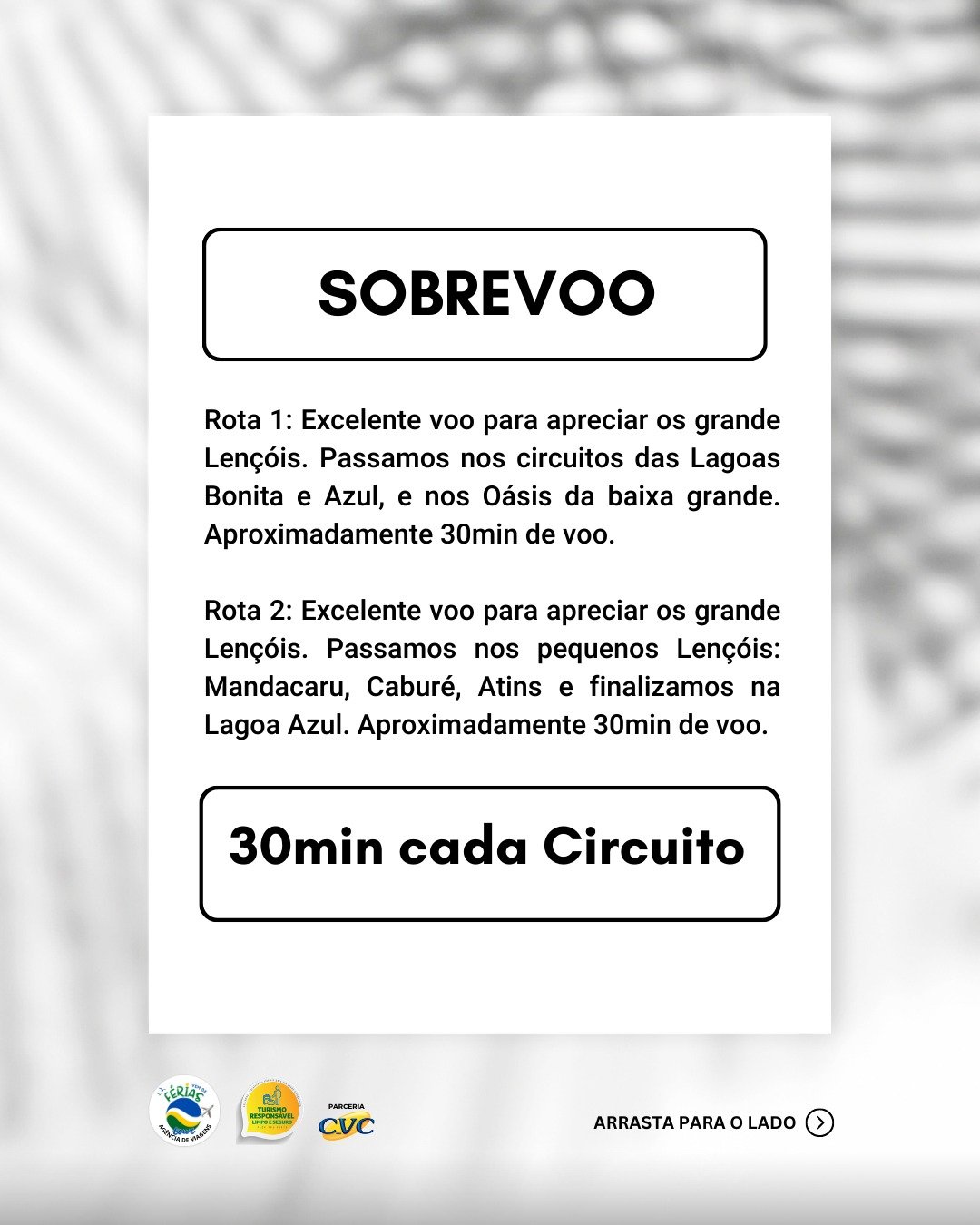 ROTA 01 – Excelente voo para apreciar os Grandes Lençóis. Passamos nos circuitos das lagoas Bonita e Azul, e nos Oásis da Baixa Grande. Aproximadamente 30 min de voo.ROTA 02 – Voo para quem deseja ver além dos Grandes Lençóis. Passamos nos Pequenos Lençóis, Mandacaru, Caburé, Atins, Oásis da Baixa Grande, e circuitos das lagoas Bonita e Azul.Aproximadamente 30 min de voo. (INCLUSO TRANSFER AO AEROPORTO)