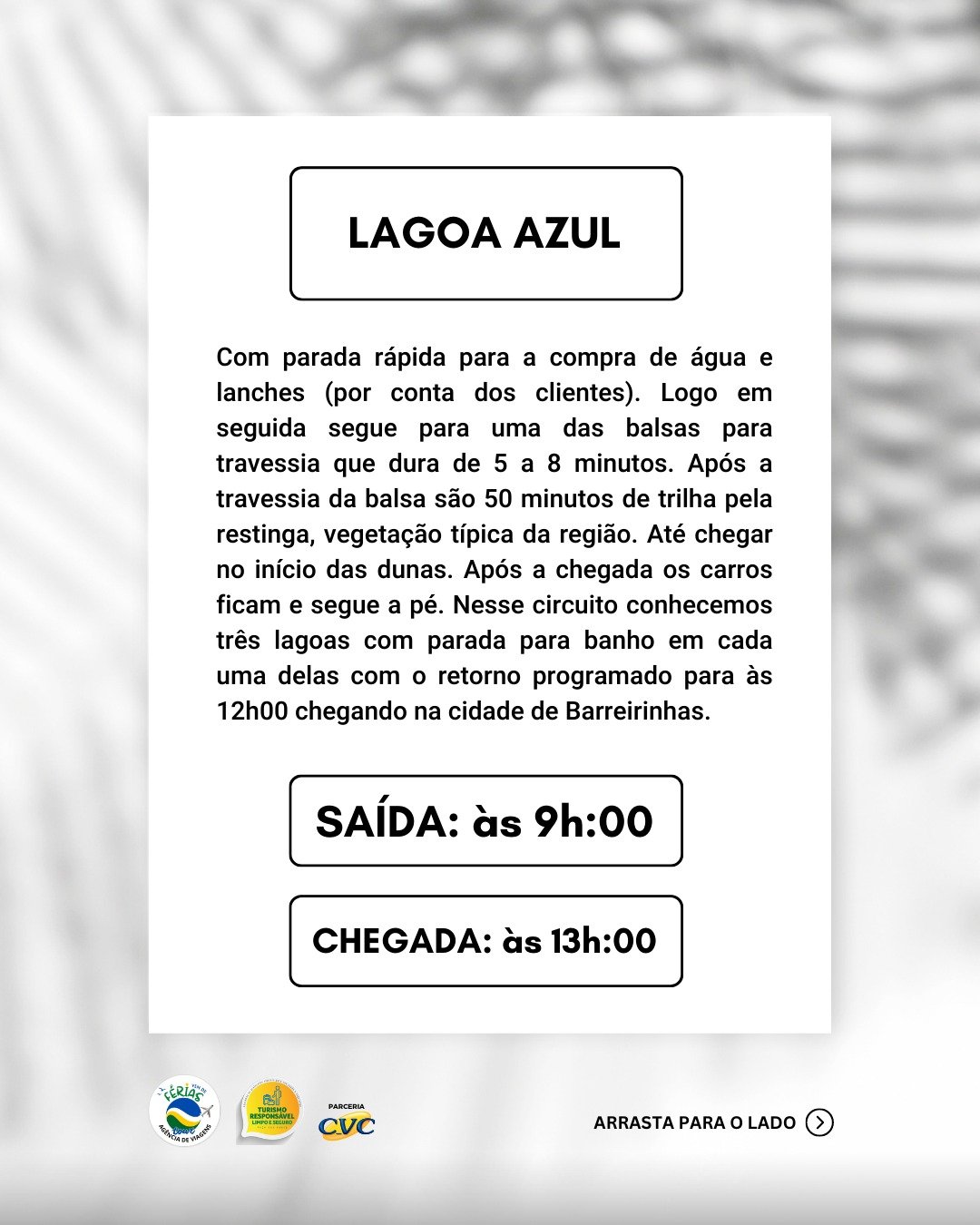 O passeio sai às 09:00, com parada rápida para a compra de água e lanches (por conta dos clientes). Logo em seguida segue para uma das balsas para travessia que dura de 5 a 8 minutos. Após a travessia da balsa são 50 minutos de trilha pela restinga, vegetação típica da região, até chegar no início das dunas. Após a chegada os carros ficam e segue a pé. Nesse circuito conhecemos três lagoas com parada para banho em cada uma delas com o retorno programado para às 12h00 chegando na cidade de Barreirinhas às 13h00 aproximadamente.OBS: Valor sujeito a alteração mediante a quantidade de pessoas.