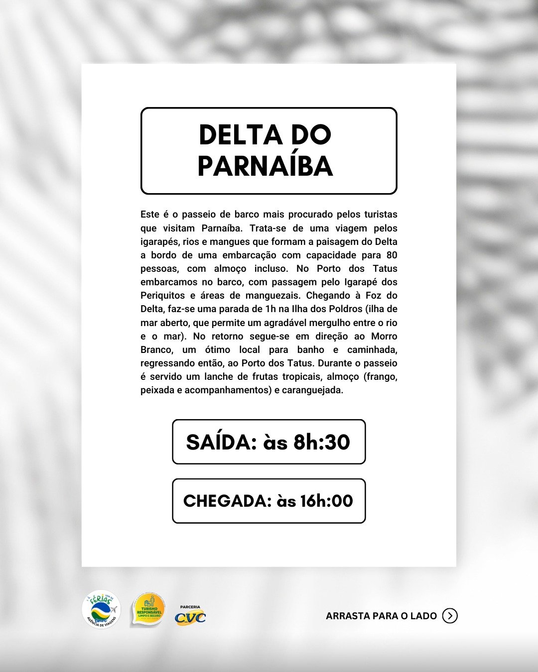 Passeio Combo de QuadriculoO Passeio Combo é feito em lanchas e quadriciclos, tendo em média duração de um dia inteiro de aventura. Saímos de Barreirinhas de lancha entre 8:00 e 9:30, onde seremos levados a diferentes pontos do Rio Preguiças. A primeira parada será em Vassouras por aproximadamente 15 minutos, onde seremos recepcionados pelos macacos-prego que habitam a região, e de onde teremos uma bela vista das dunas dos Pequenos Lençóis. Segunda parada será na comunidade de Mandacaru, com 15 minutos de parada, conhecida por seu farol histórico, são 35 metros de uma linda vista que contempla toda a região, além de podermos provar sorvestes de frutas regionais e diferentes sabores de cachaças, ainda tem os famosos artesanatos de fibra de buriti. Em seguida, chegaremos a Caburé, onde teremos a opção de encomendar um saboroso almoço regional (não incluso), desfrutar de um banho de mar e também do rio.