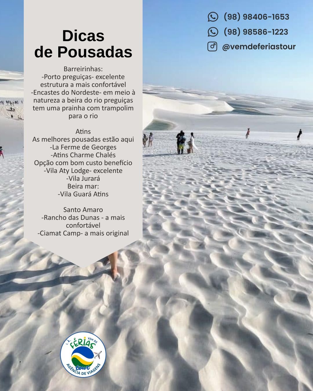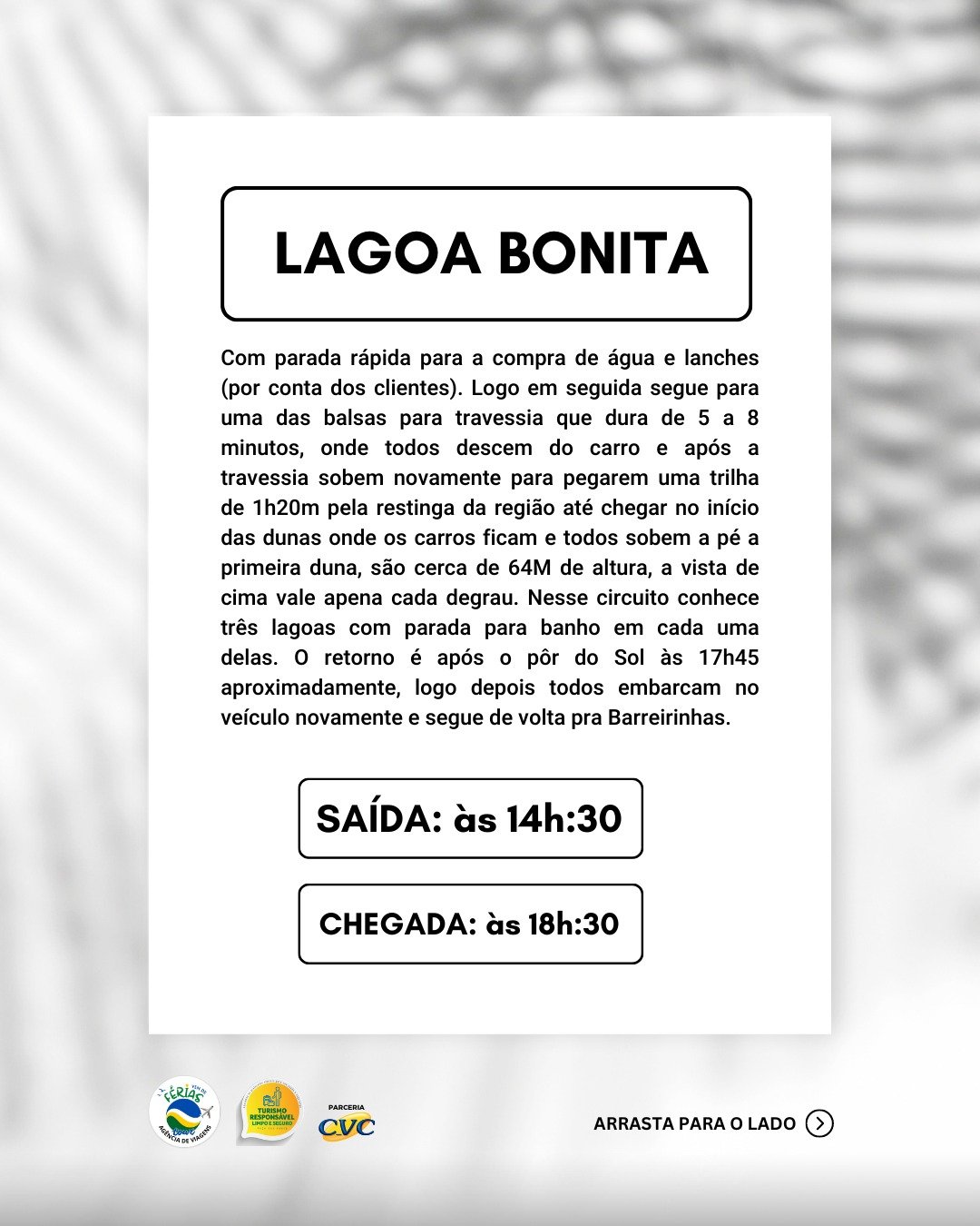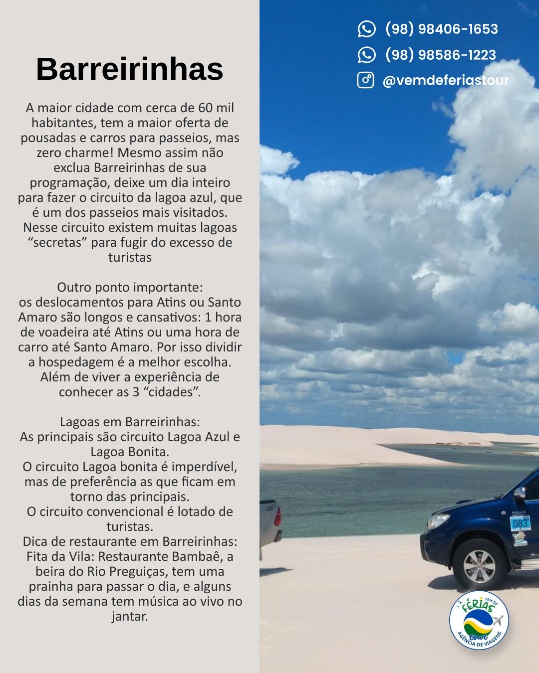 O passeio sai às 09:00, com parada rápida para a compra de água e lanches (por conta dos clientes). Logo em seguida segue para uma das balsas para travessia que dura de 5 a 8 minutos. Após a travessia da balsa são 50 minutos de trilha pela restinga, vegetação típica da região, até chegar no início das dunas. Após a chegada os carros ficam e segue a pé. Nesse circuito conhecemos três lagoas com parada para banho em cada uma delas com o retorno programado para às 12h00 chegando na cidade de Barreirinhas às 13h00 aproximadamente.OBS: Valor sujeito a alteração mediante a quantidade de pessoas.