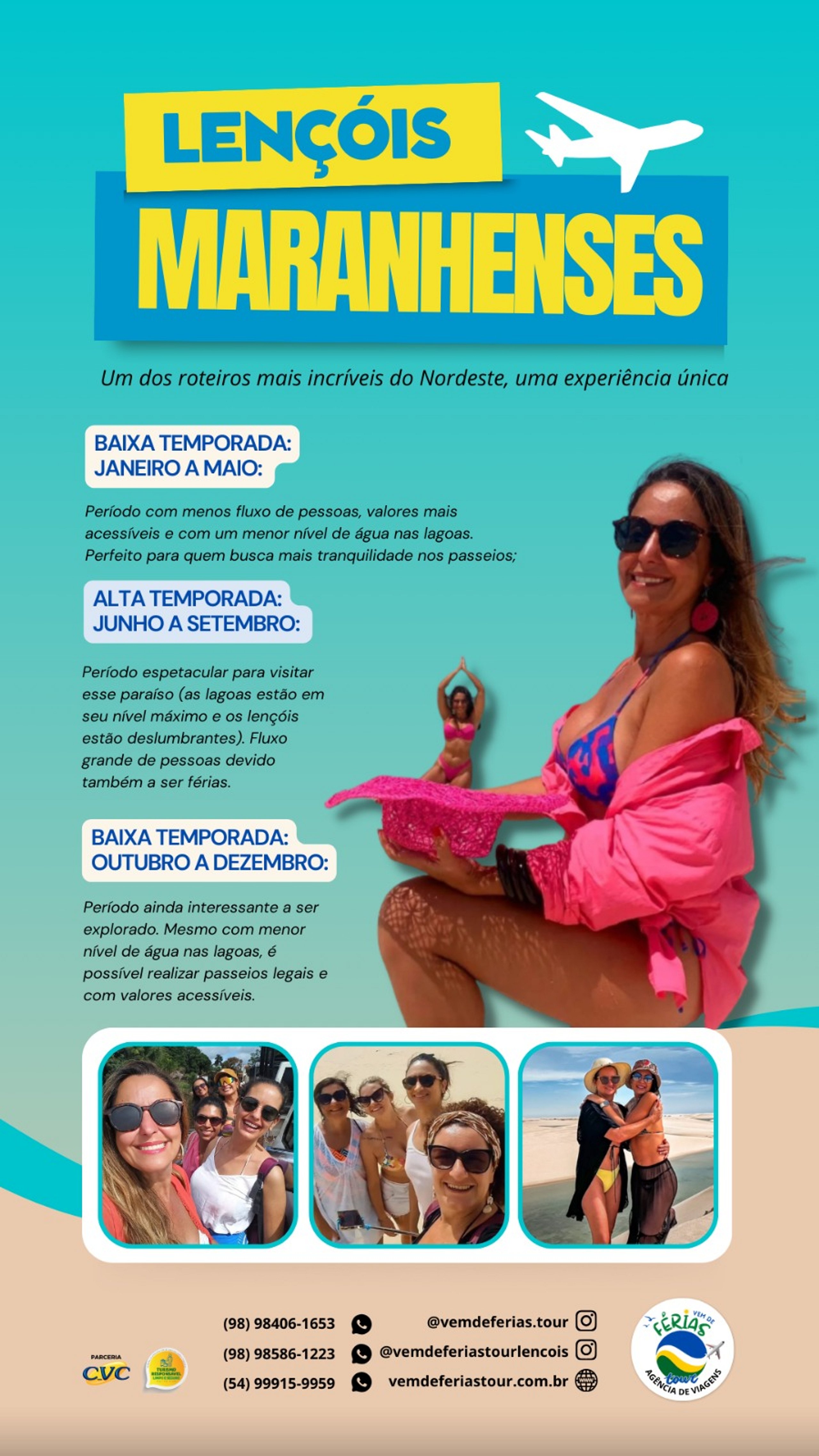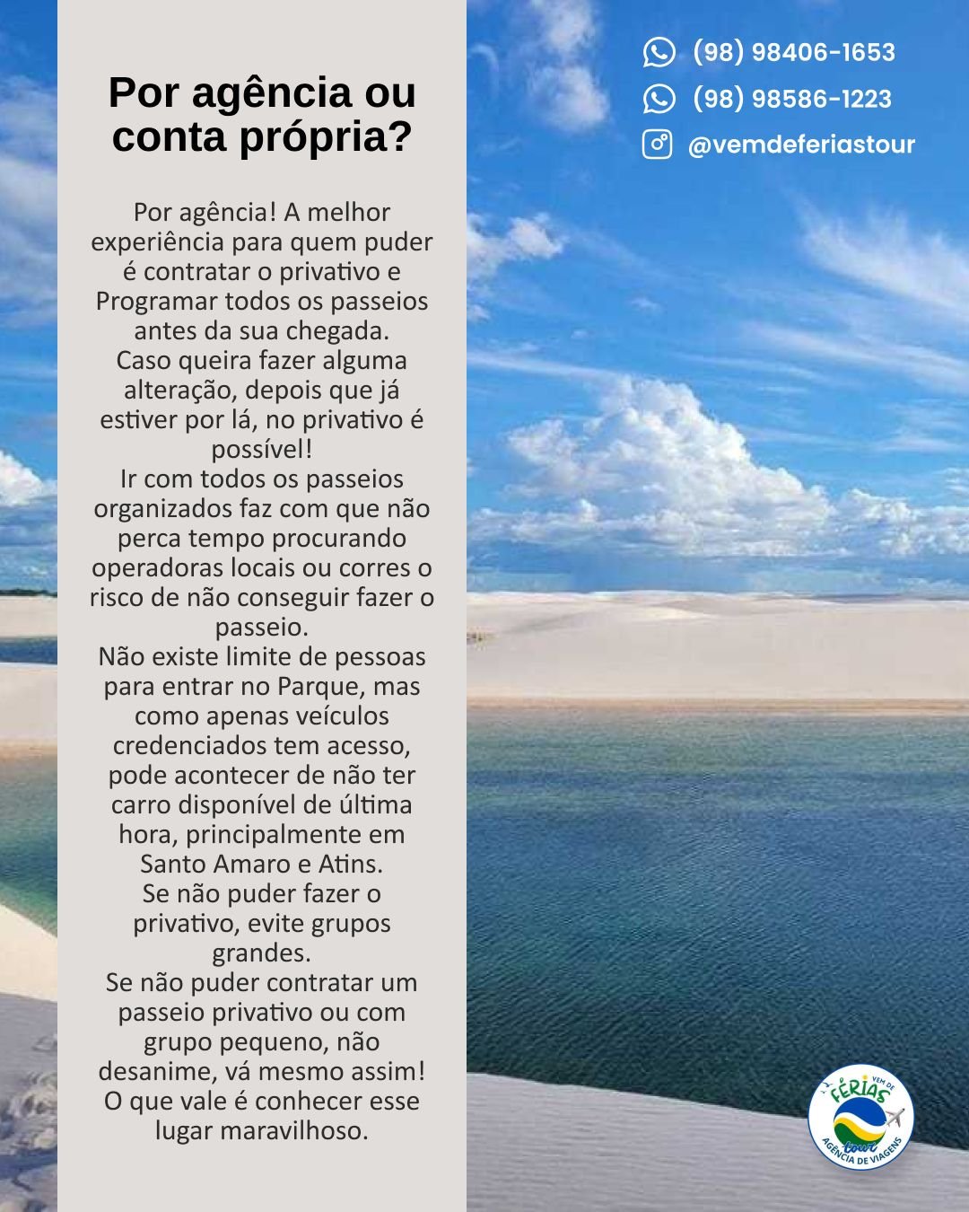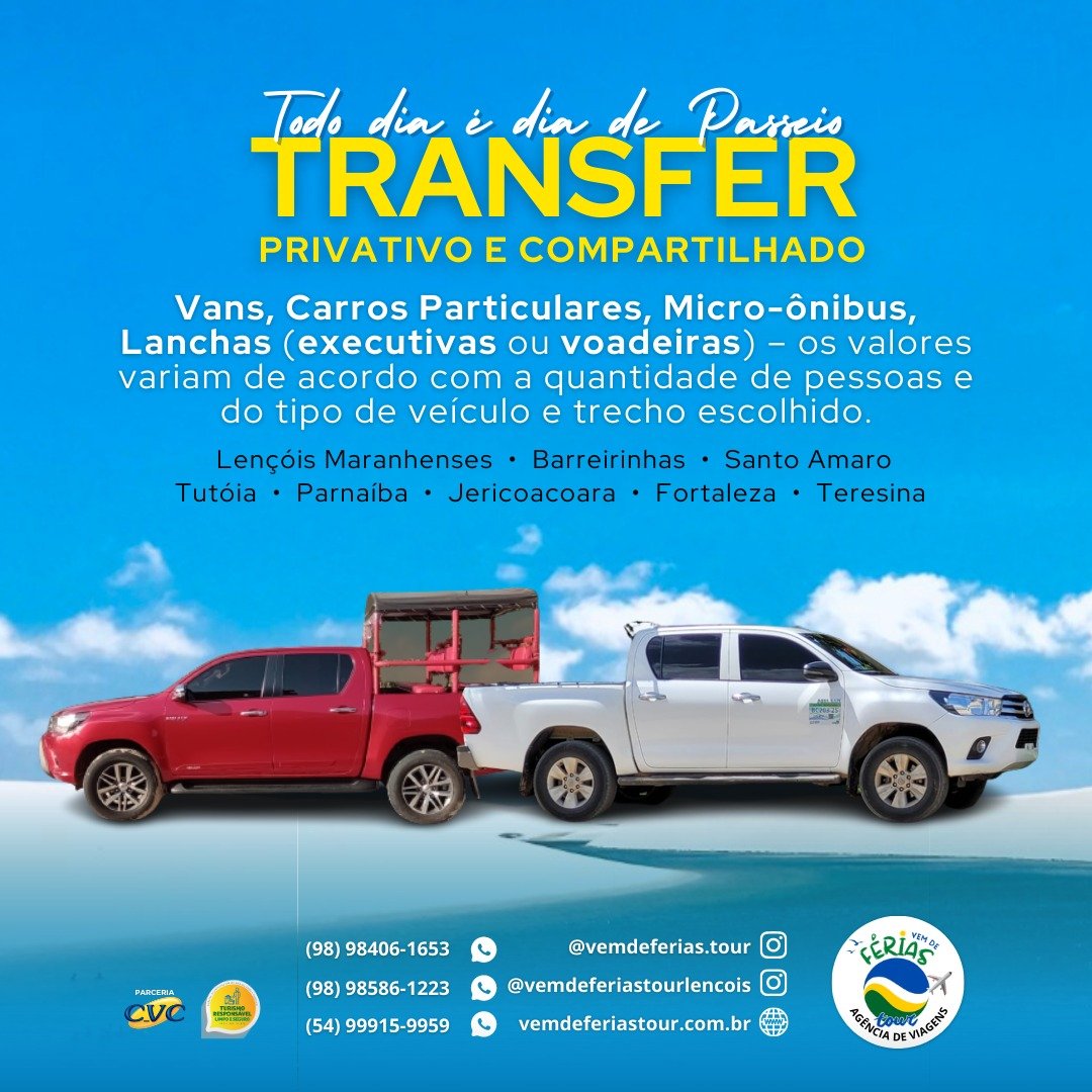 O passeio sai às 09:00, com parada rápida para a compra de água e lanches (por conta dos clientes). Logo em seguida segue para uma das balsas para travessia que dura de 5 a 8 minutos. Após a travessia da balsa são 50 minutos de trilha pela restinga, vegetação típica da região, até chegar no início das dunas. Após a chegada os carros ficam e segue a pé. Nesse circuito conhecemos três lagoas com parada para banho em cada uma delas com o retorno programado para às 12h00 chegando na cidade de Barreirinhas às 13h00 aproximadamente.OBS: Valor sujeito a alteração mediante a quantidade de pessoas.