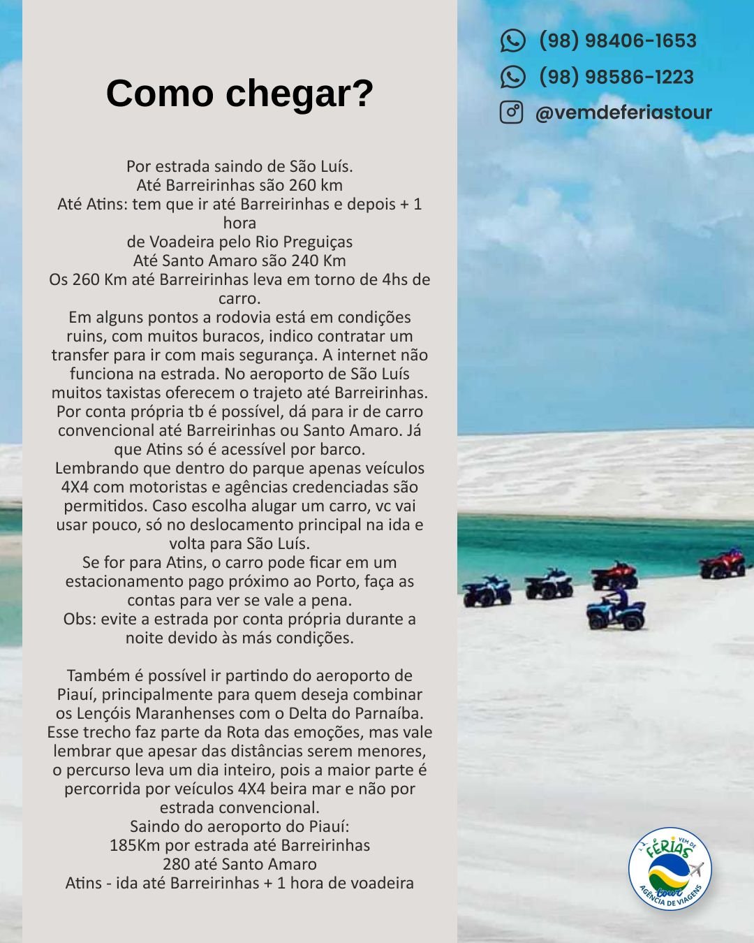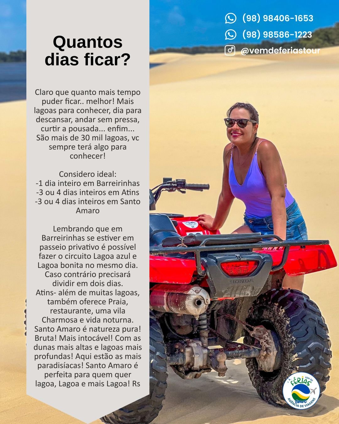 Esse passeio é o dia inteiro. Para quem procura aventura e emoção, esse é o passeio ideal. Vamos para um local de saída às 08:30 onde recebemos uma breve instrução sobre a condução do equipamento e quem irá conduzir. A previsão de saída é as 09h00. Após a saída percorre uma estrada por mais ou menos 50 minutos até o início das dunas, passa por caminhos muitas vezes de difícil acesso, mas tudo faz parte da aventura. Chegando no início dos Pequenos Lençóis é possível subir por eles e percorrer um trecho por cima das dunas com parada para banho em lagoas perenes dos Pequenos Lençóis. Depois segue caminho, dessa vez por um trecho bem próximo a praia, até chegar a praia de Caburé, onde paramos para o almoço (não incluso no valor do passeio), comum tempo para banho na praia e por volta das 14h30 retornamos para Barreirinhas com previsão de chegada às 17:30.OBS: Valor sujeito a alteração mediante a quantidade de pessoas.