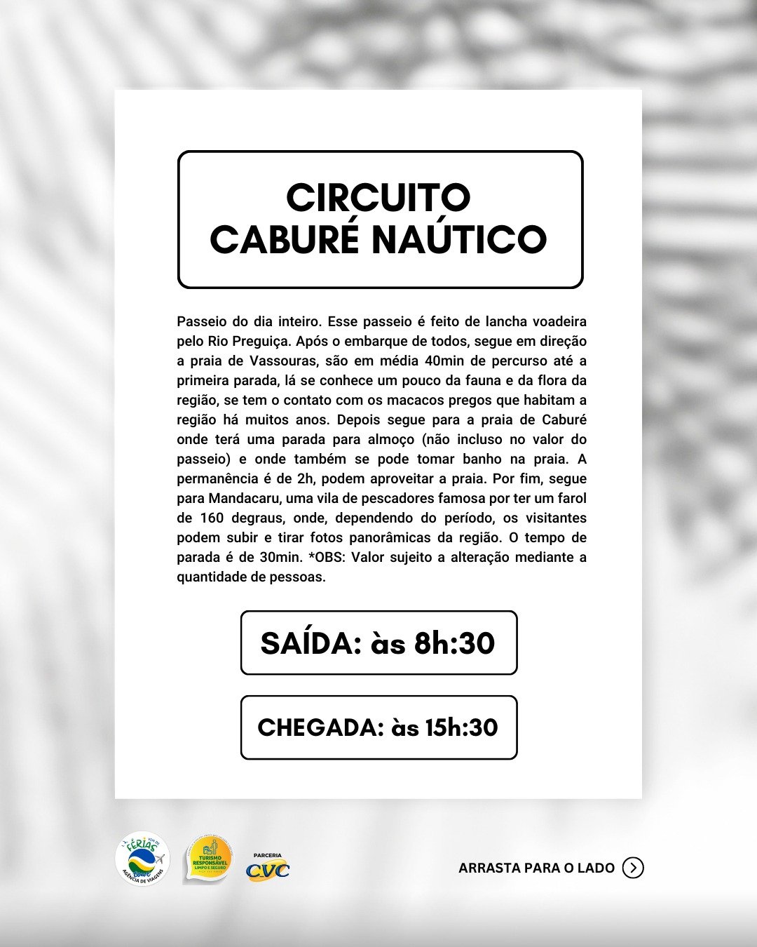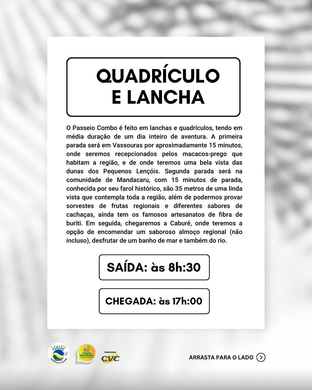 Passeio Combo de QuadriculoO Passeio Combo é feito em lanchas e quadriciclos, tendo em média duração de um dia inteiro de aventura. Saímos de Barreirinhas de lancha entre 8:00 e 9:30, onde seremos levados a diferentes pontos do Rio Preguiças. A primeira parada será em Vassouras por aproximadamente 15 minutos, onde seremos recepcionados pelos macacos-prego que habitam a região, e de onde teremos uma bela vista das dunas dos Pequenos Lençóis. Segunda parada será na comunidade de Mandacaru, com 15 minutos de parada, conhecida por seu farol histórico, são 35 metros de uma linda vista que contempla toda a região, além de podermos provar sorvestes de frutas regionais e diferentes sabores de cachaças, ainda tem os famosos artesanatos de fibra de buriti. Em seguida, chegaremos a Caburé, onde teremos a opção de encomendar um saboroso almoço regional (não incluso), desfrutar de um banho de mar e também do rio.