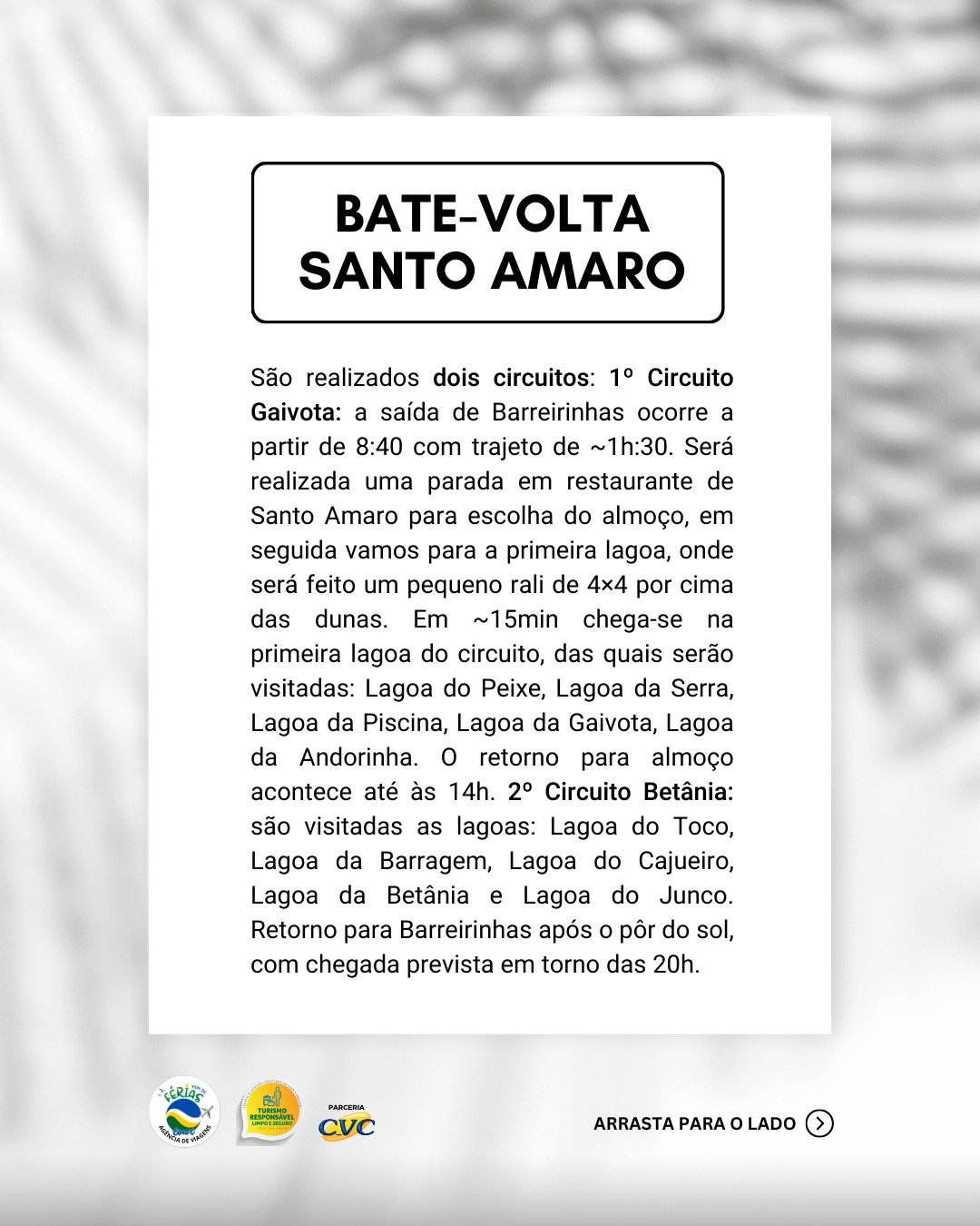 O embarque começa às 07h30, assim que todos forem embarcados seguimos para Santo Amaro, duração de 1h30 até Santo Amaro. Ao chegar em Santo Amaro fazemos uma parada no restaurante para reservar o almoço, em seguida partimos para a primeira lagoa num pequeno rali por cima das dunas em 4X4 com duração de 10 a 15 minutos. Visitamos as seguintes lagoas: